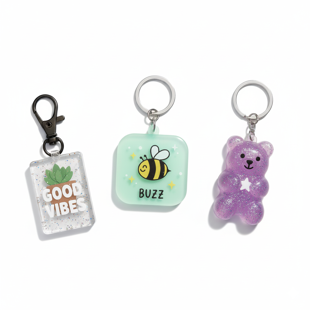 • Plastic and acrylic keychains are lightweight, colorful, and ideal for high-volume production. They can be digitally printed or molded into creative shapes, which makes them popular choices for promotional use, events, and youth-oriented designs. Their affordability allows brands to experiment with vibrant patterns and low-cost customization.
